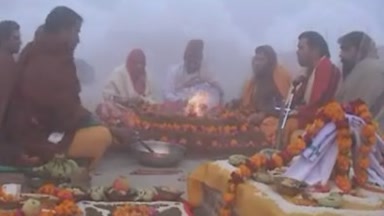 Morning program from Om Ashram, Rajasthan, India. Swami Madhuram Puri singing bhajans (Prakash Punja ...), and preparing the Kalash.