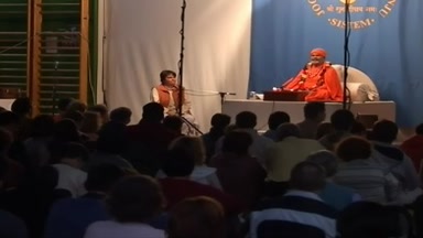 Evening satsang from Jaipur Ashram, Rajasthan, India. Alakhpuriji is the light of Siva. Mahaprabhuji is the light of the sun. The story how Vishwaguruji became sanyas and how he began his sanyas lefe with Guruji. Vishwaguruji tells some of his visions of Mahaprabhuji in Viena. He tells Holiguruji's vision of Sri Devpuriji in India. Guru and disciple should become one. Mother and father and their child are also one. The story of how a bhramari makes the worm to bhramari too. Practising bhramari pranayama with different positions of the hands. Concentration on the effects of bhramari pranayama.